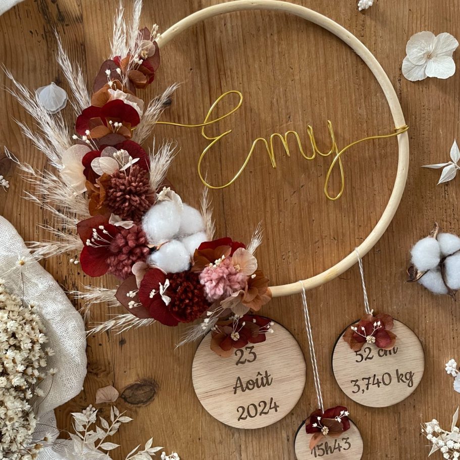 Pour célébrer l’arrivée d’un tout-petit, je réalise des créations douces et personnalisées, pleines de tendresse. Couronnes, décorations ou attentions uniques, chaque pièce est conçue pour accompagner ces premiers instants si précieux et créer de jolis souvenirs.